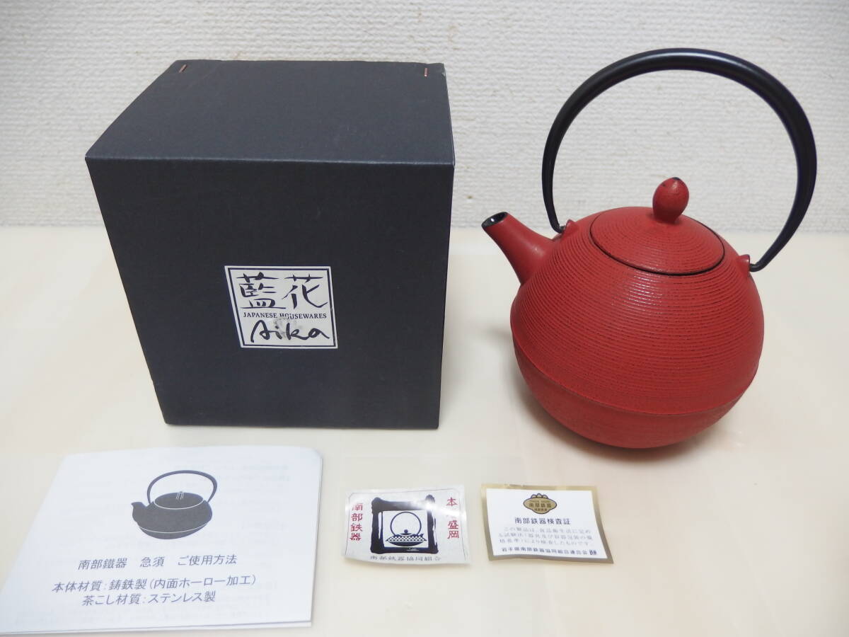 - 6)南部岩鋳 鉄瓶 日の丸形 「藍花Aika」 朱 未使用品 (直火使用可)