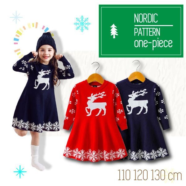- 送料無料 ノルディック柄ワンピース トナカイ 北欧柄 選べるサイズ&カラー クリスマス 長袖 女の子 子供 キッズ かわいい 子供服 ニット