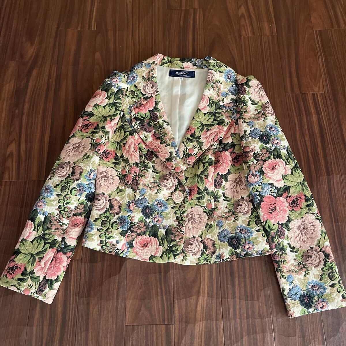 - 【超美品】エムズグレイシー カタログ掲載ベスト同柄 ジャガード/ゴブラン調プリント/薔薇モチーフボタン/ジャケット 38