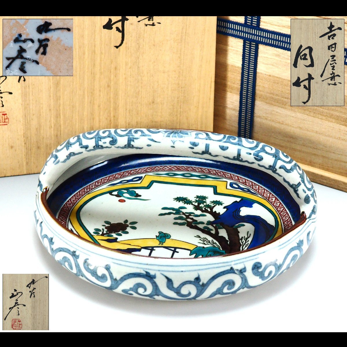 > 【治】人間国宝 三代『徳田八十吉(正彦)』作 吉田屋意 風景図 向付☆共箱 幅 24.5cm 菓子鉢 菓子器 菓子皿 九谷焼 本物保証 NI11