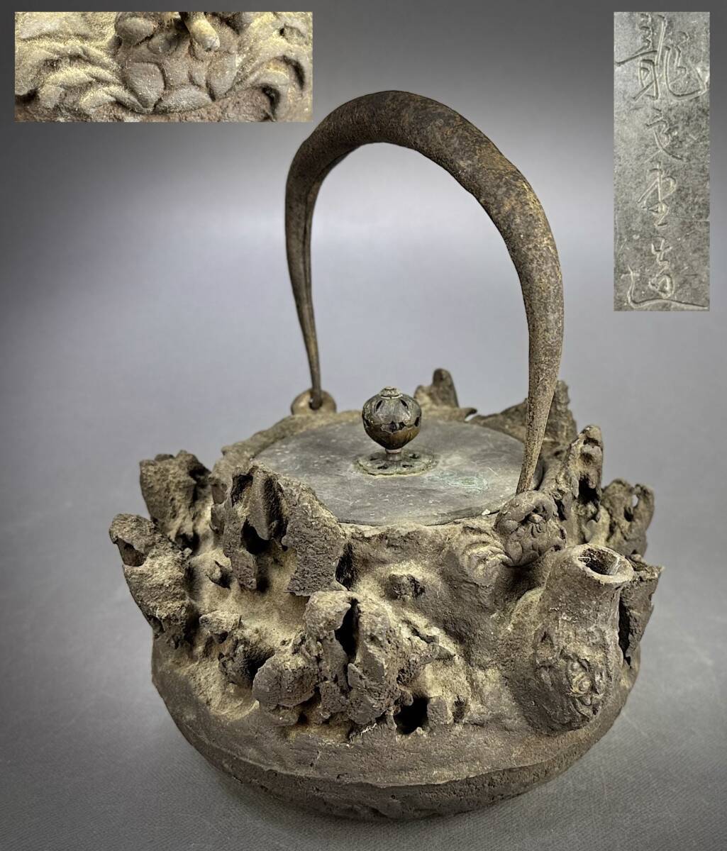 > 【偲】龍文堂 蟹文岩口鉄瓶 銅蓋 茶道具 浮き彫り 高約18.5㌢ 重さ約1890g 茶注 湯沸 骨董 鉄壺 湯沸し k-60