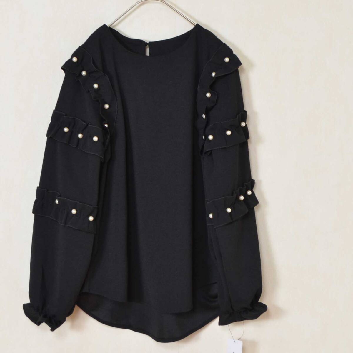 - トップス レディース お袖フリルパール付T M〜L|華やかフリル袖×パール装飾・長袖トップス 199923 ブラック