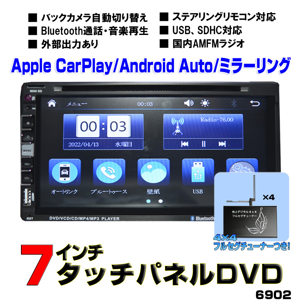 - Apple CarPlay Android Auto ミラーリングブルートゥース外部入力USB SD動画音楽車載DVDプレーヤー+地デジ4x4フルセグチューナーセット