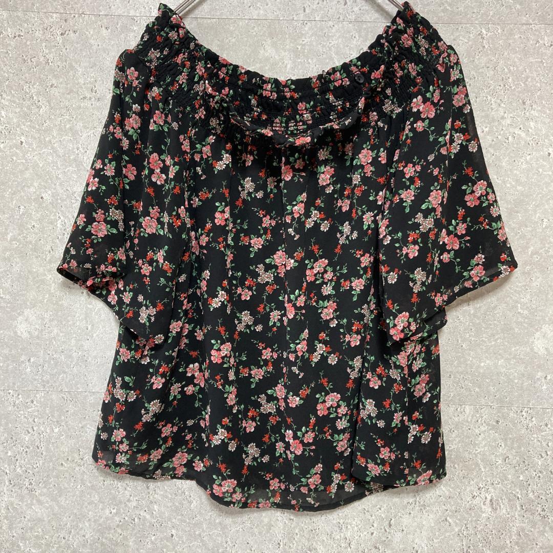 - マジェスティックレゴン(M)花柄フリルブラウス*半袖*総柄*裏地*透け感*黒