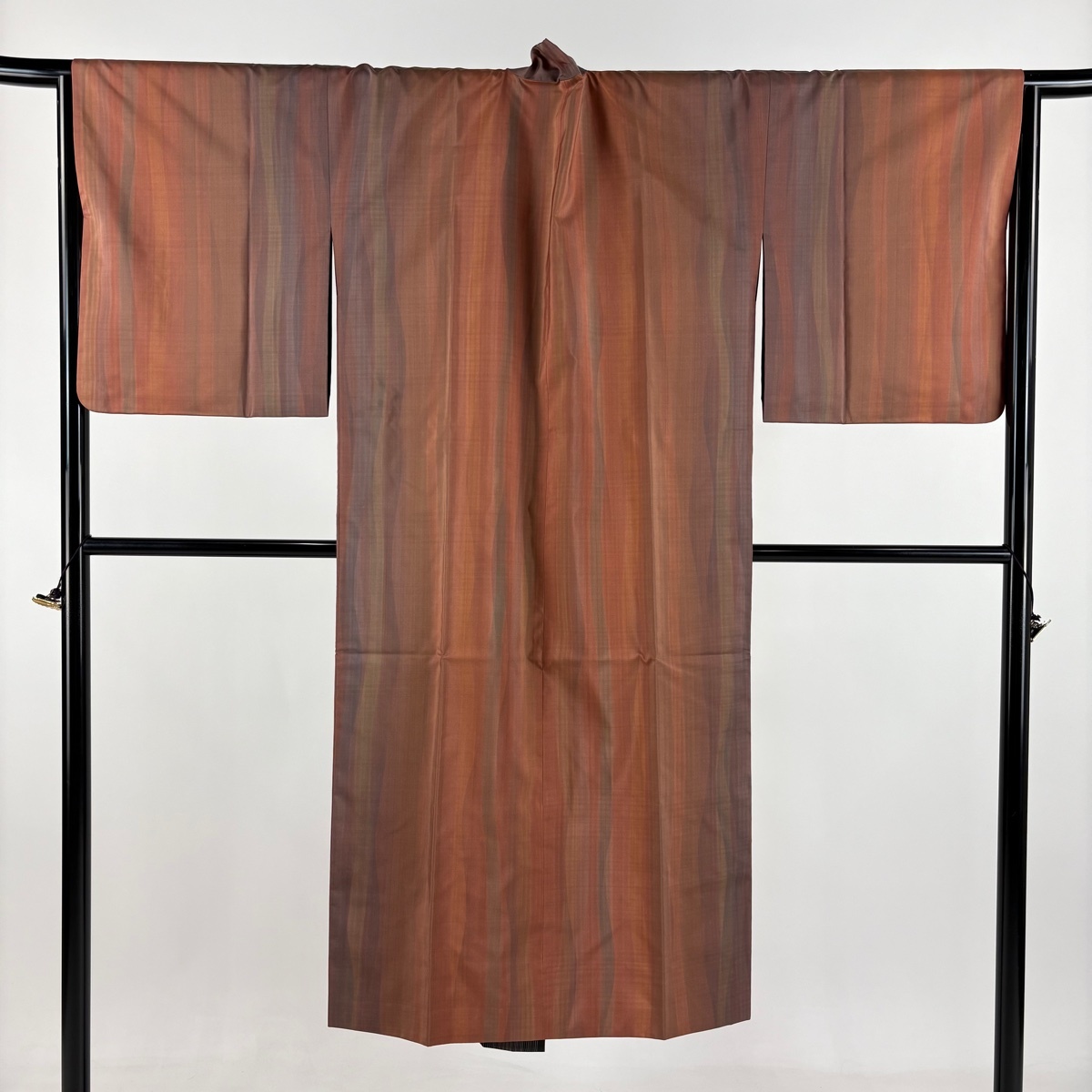 - 【美品】 道中着 身丈131.5cm 裄丈67cm M 和装コート 着物衿 リバースブル 大島紬地 落款 証紙 縞 赤茶 正絹 名品 【中古】