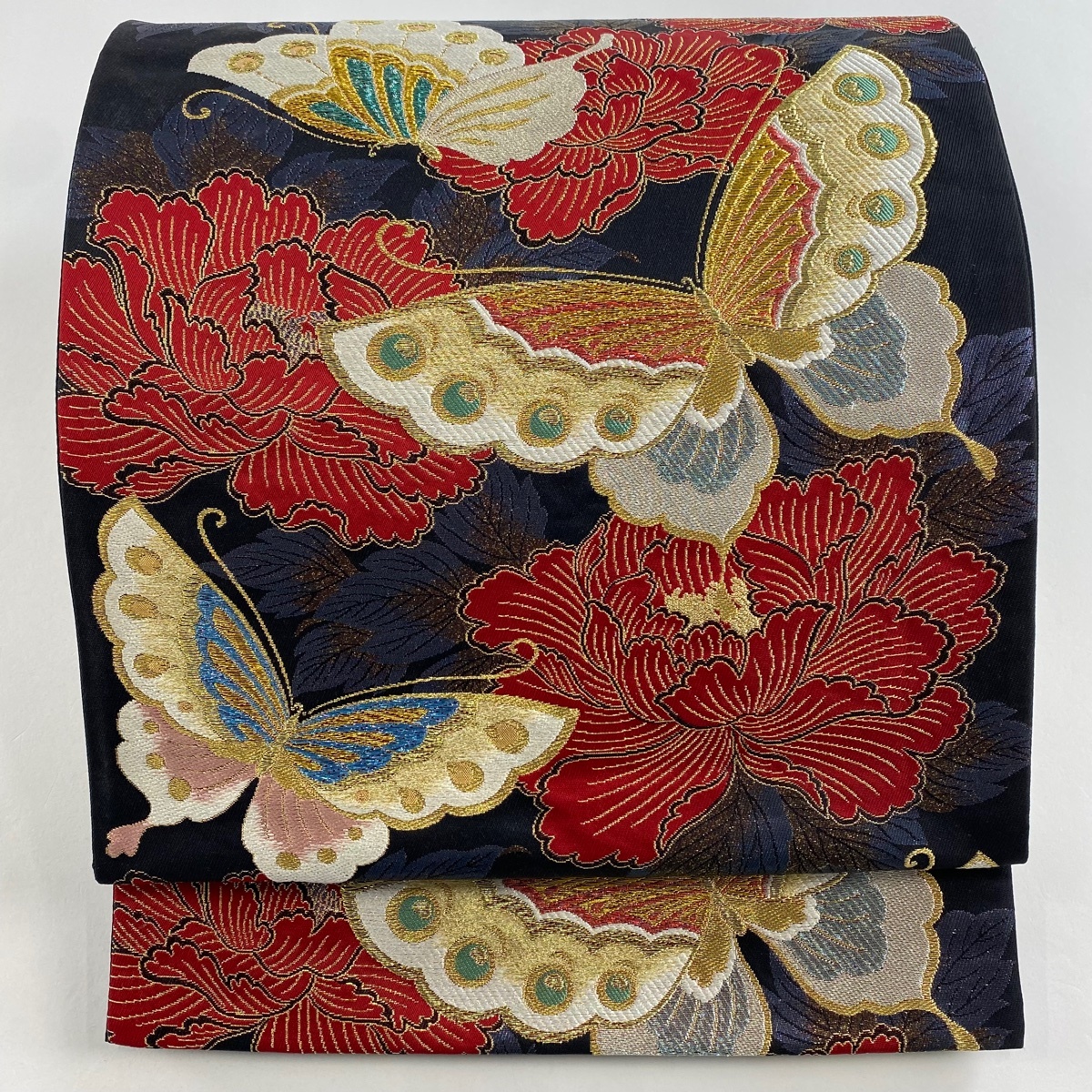 - 【美品】 袋帯 秀品 牡丹 蝶 金銀糸 箔 黒 六通 正絹 【中古】