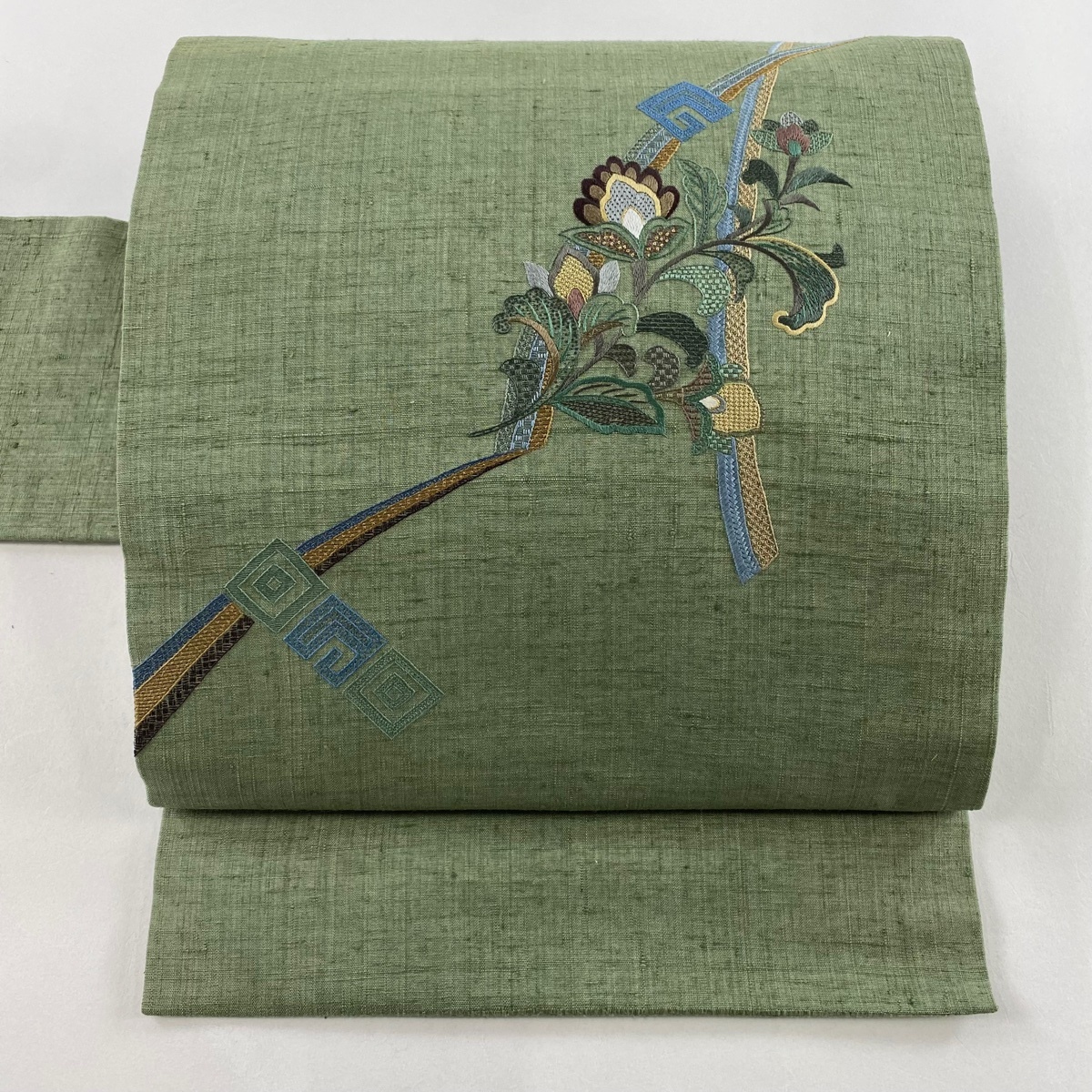 - 【美品】 名古屋帯 秀品 紬地 草花 幾何学模様 刺繍 金糸 灰緑 正絹 【中古】