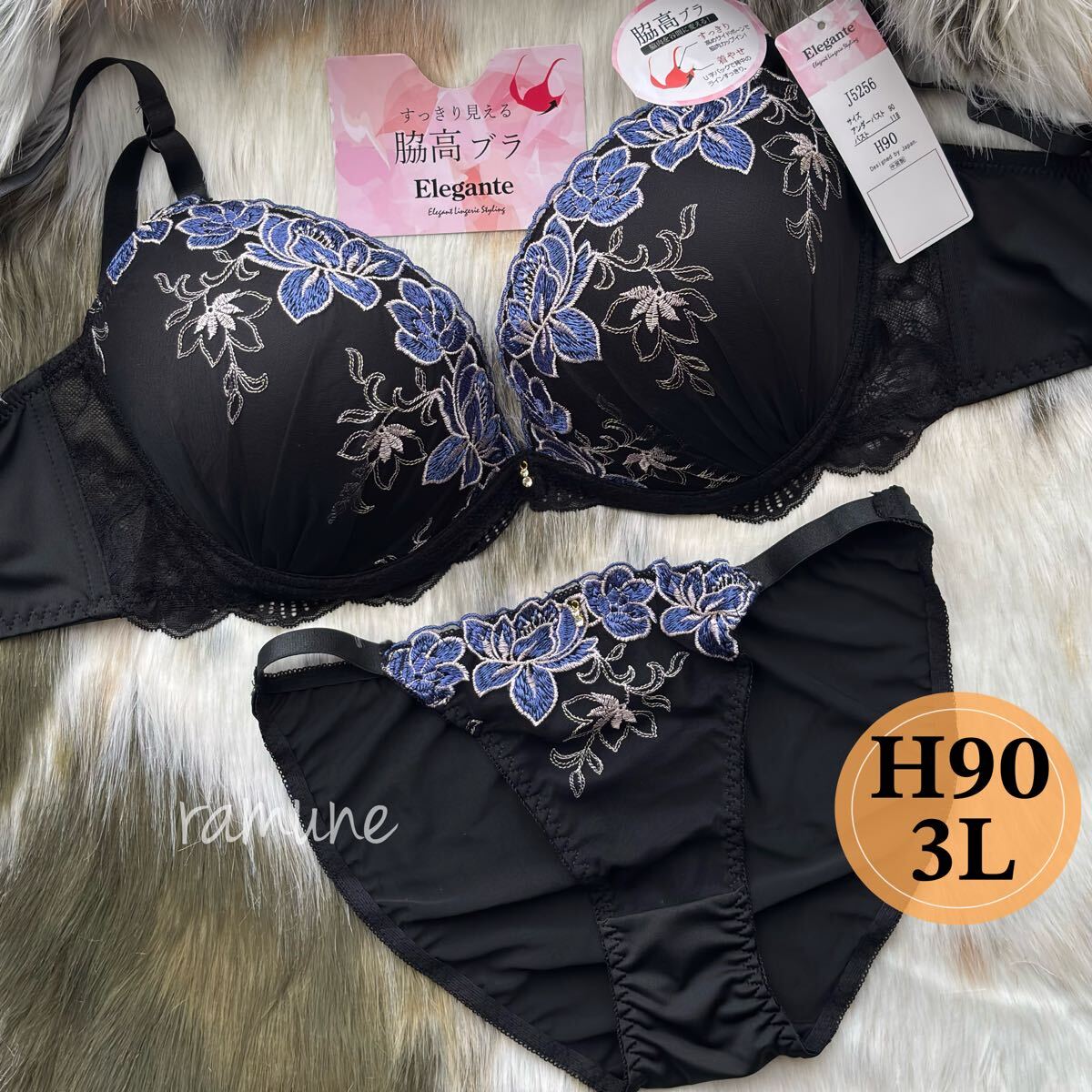 - ラスト【H90 3L ブラック】新品 ブラ&ショーツ ブラジャーショーツ 脇高 モールドカップ内蔵 レース 大きいサイズ 花柄刺しゅう パンティ