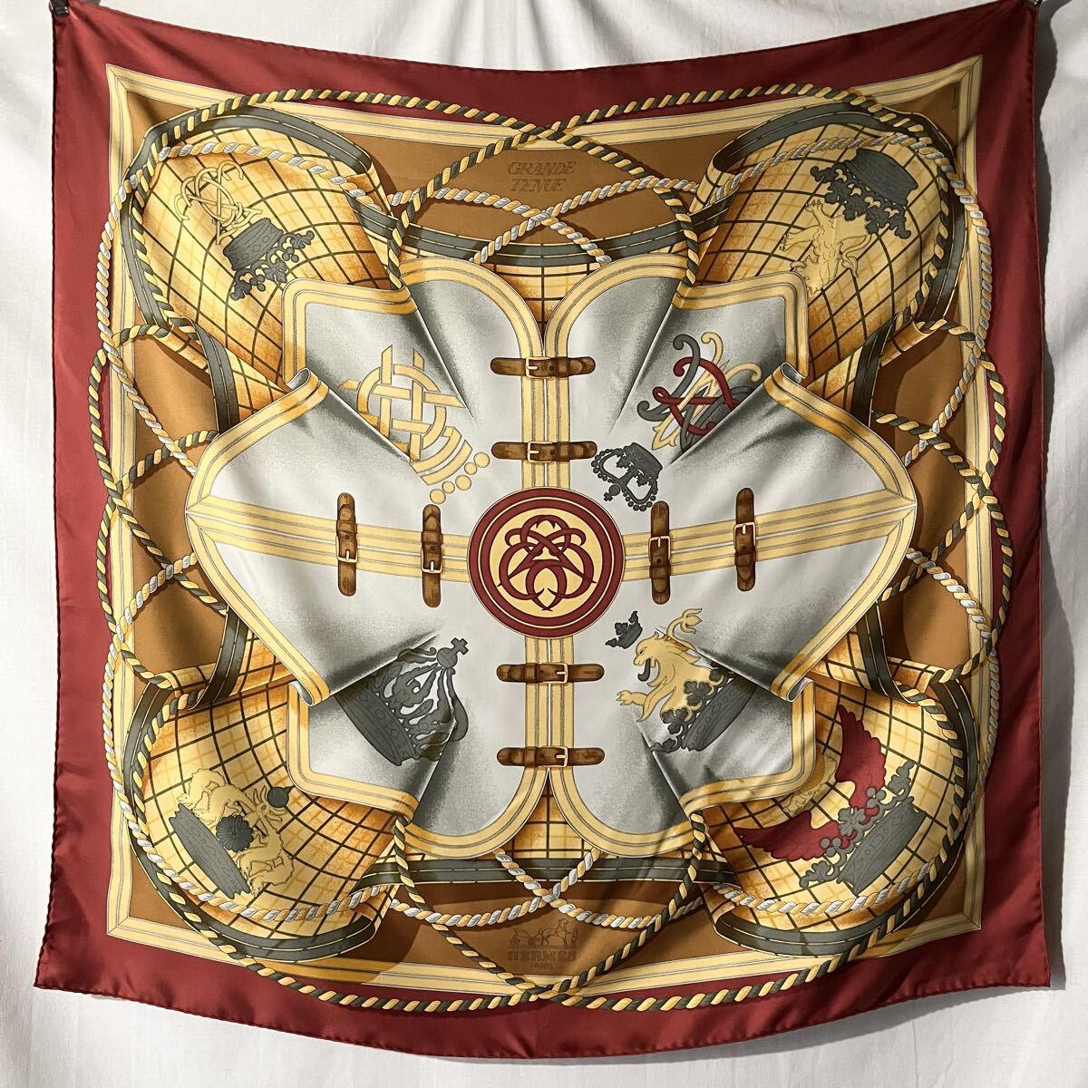 - HERMES エルメス カレ 90 GRANDE TENUE 馬の礼装 シルクスカーフ 総柄 フランス製 橙色 ヴィンテージ OLD