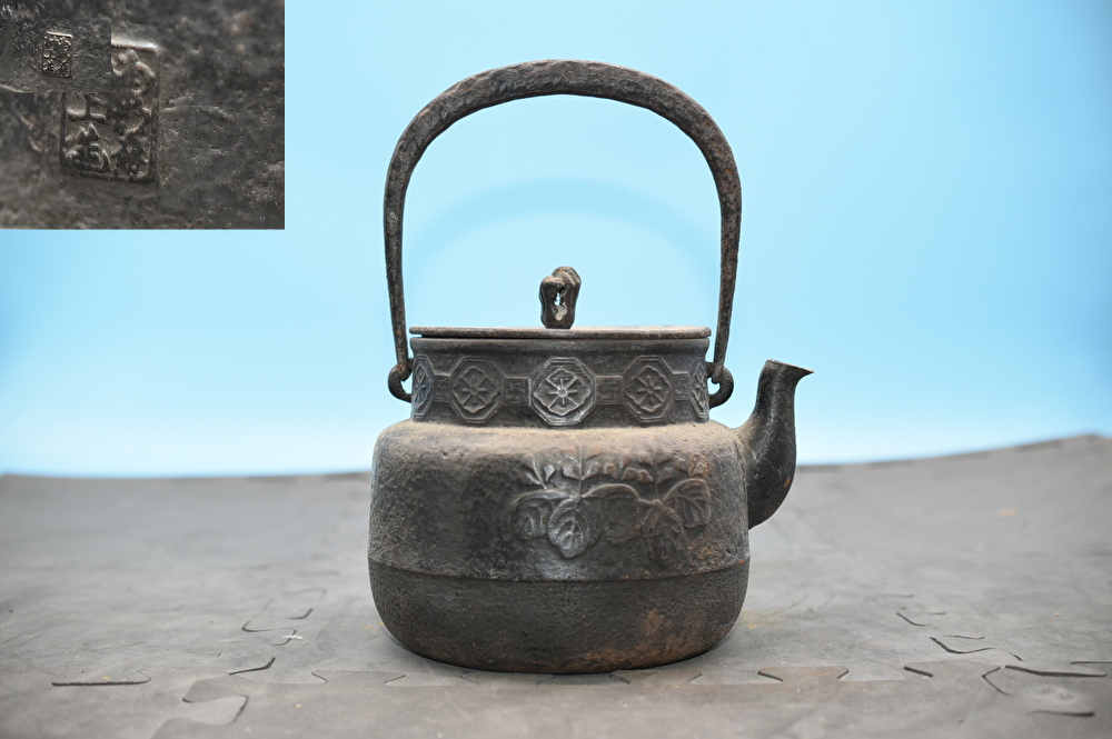 - TY10-6 南部鉄器 鉄瓶 村上造 桐紋様 八角花紋様 帯 茶道具 煎茶道具 古美術 骨董 金属工芸 工芸品 総重量約1.55kg 長期保管 現状品