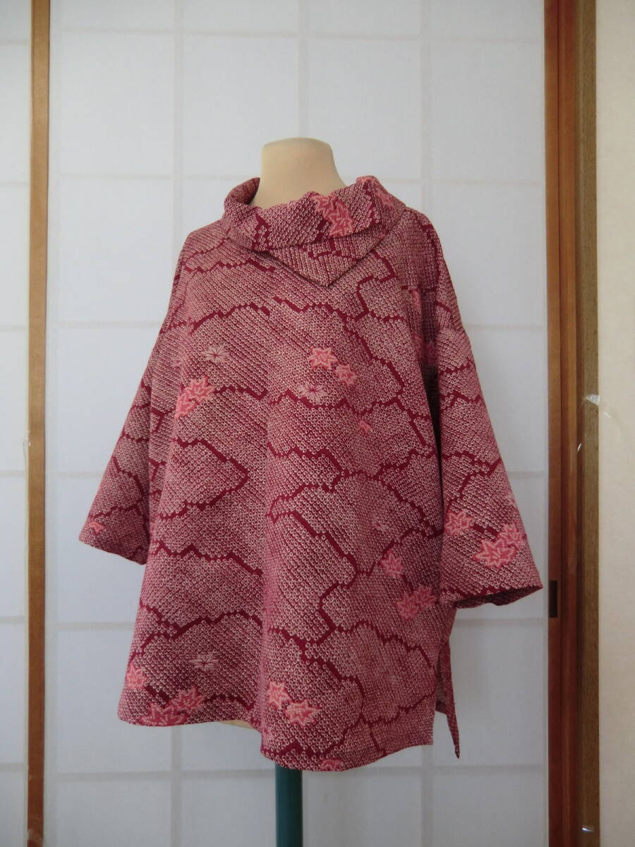 - 着物リメイク☆正絹 総絞り柄雲取りに紅葉柄羽織 袖付きブラウスチュニック☆重ね衿