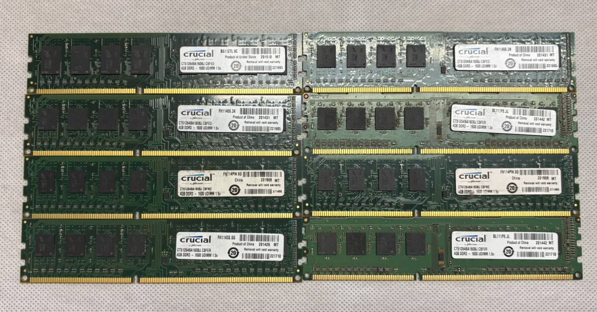 | | | crucial デスクトップパソコン用 メモリ DDR3 PC3-1600 1Rx8 4GB x 8枚セット | | | | こちらの商品は、実働機より取り出し、保管していたメモリになります。 動作未確認のため、動作保証はいたしかねますので気になる方はご遠慮ください。
