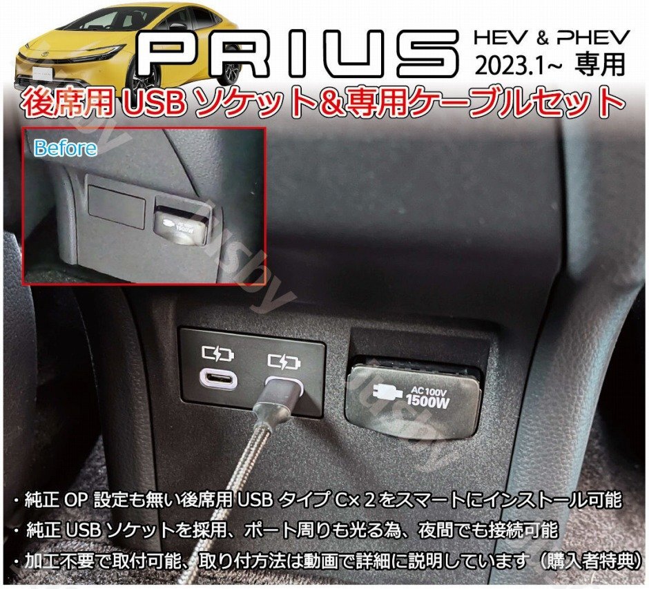 - 新型プリウス 60系 後部座席用USBソケット&ケーブルSET 後席USB タイプC 純正ソケット採用 リヤシート用 USB追加アダプタ カーパーツ
