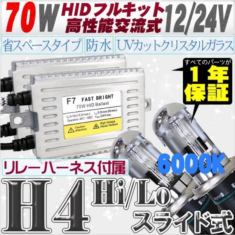 - 高性能 薄型HIDキット 70W H4 Hi/Lo スライド式 リレー、キャンセラー付 6000K 12V/24V 【交流式バラスト&クリスタルガラスバーナー】