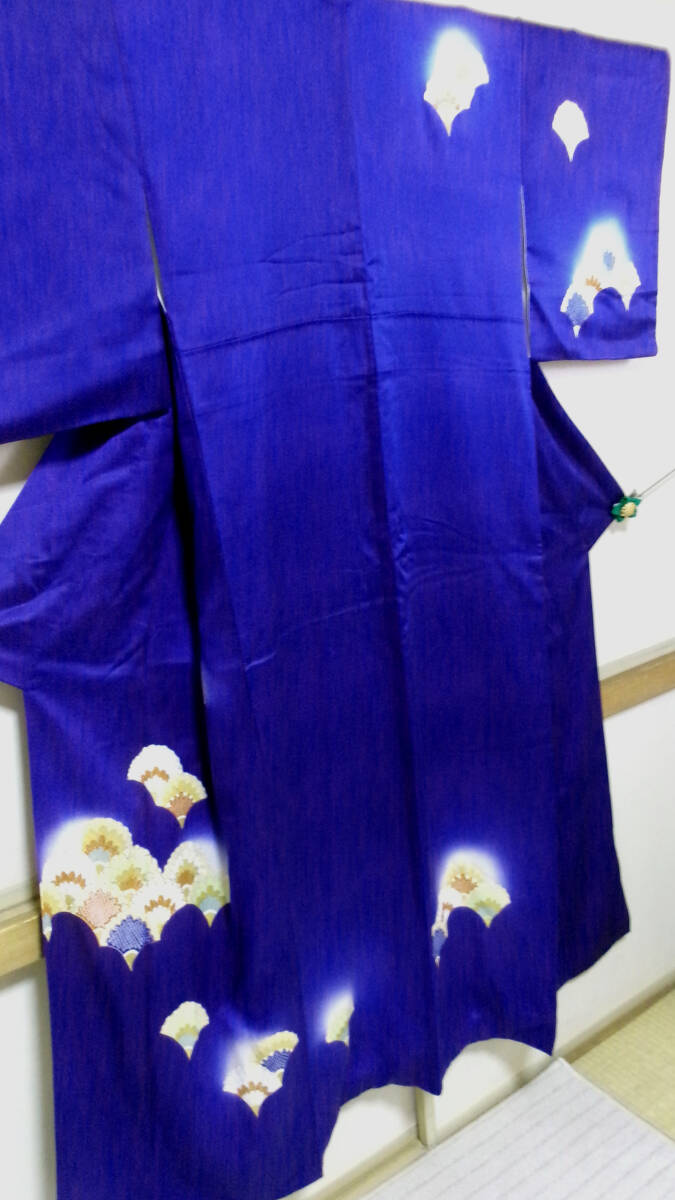- 580 青色青海波扇華模様※金駒刺繍あり※正絹※袷※付け下げ※着物 丈155 裄63