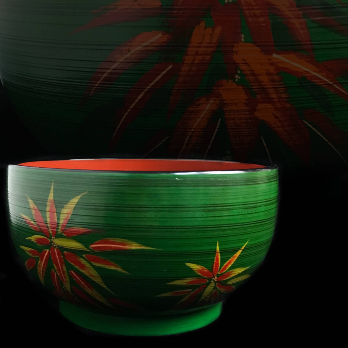 - FNY32/91 逸品 橋本春路 色絵笹文大鉢 漆器 菓子鉢 高さ13㎝ 直径23㎝ 工芸品 レトロ 春路作 多目的ボウル 中古 緑色 茶道具 食器◎