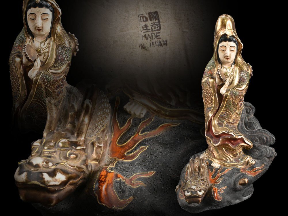 - 【雲】某寺院放出品 九谷 色絵龍乗観音菩薩 置物 22×23×42cm 古美術品(仏教美術仏像オブジェ)BJ1772 DTokjh