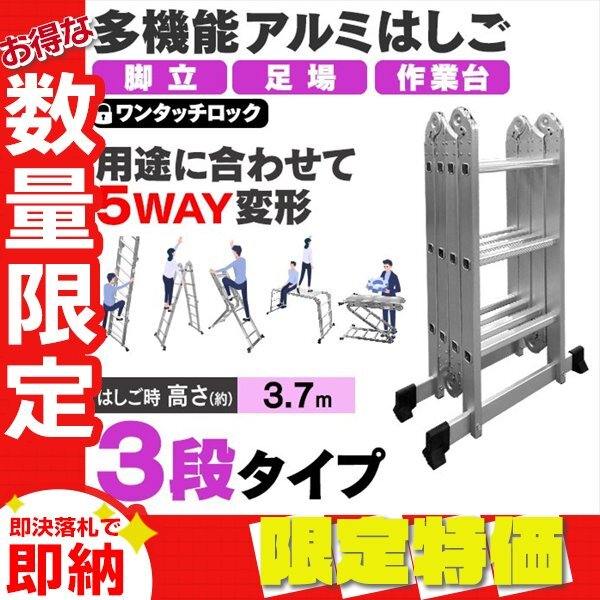> 【限定セール】多機能はしご 3.7m 耐荷重150kg 3段タイプ 万能 アルミはしご 脚立 折りたたみ スーパーラダー 洗車 カーポート 雪下ろし