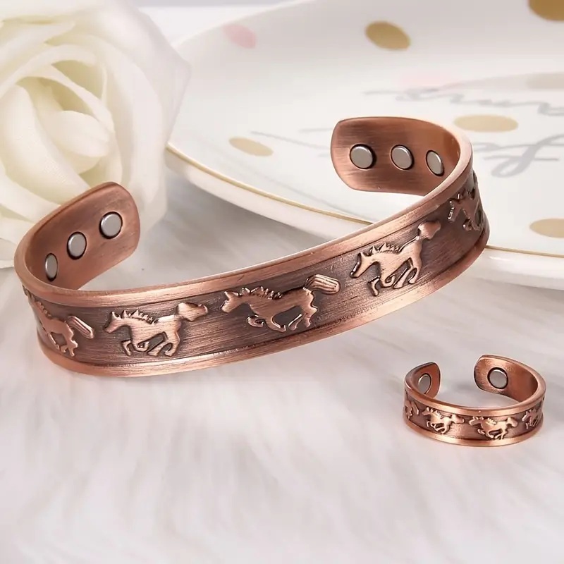 - 健康磁気ブレスレットとリングセット銅製ジュエリー調節可能フリーサイズ男女兼用馬デザイン午年生まれや馬は開運ですパワーストーンに便利