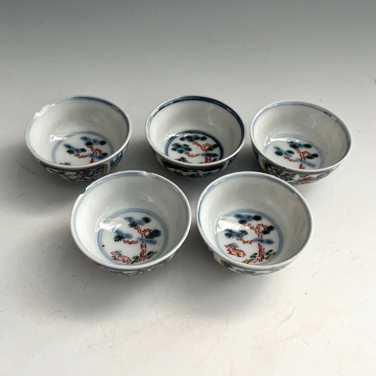 - 初荷 染付 五彩 大明成化年製 款 煎茶碗 五客 三客ホツレ有り B7-53