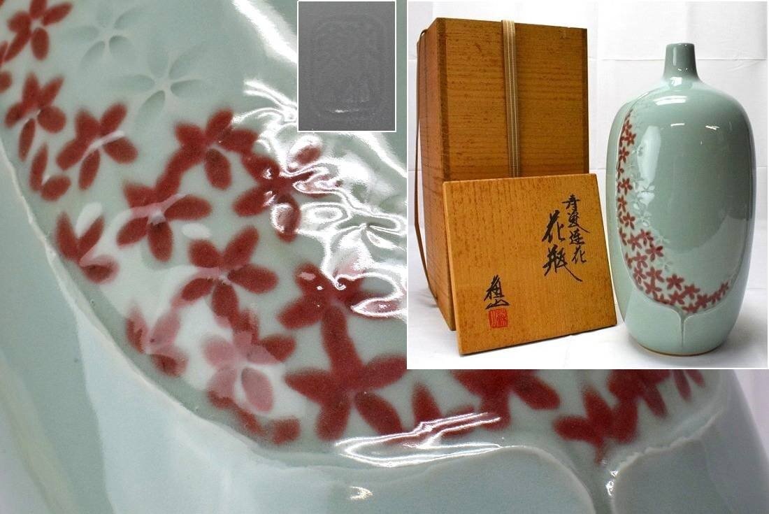 【三代 諏訪蘇山】作 辰砂 青磁連花 花瓶 花入 高30cm 共箱 栞付 煎茶 茶道具拍卖