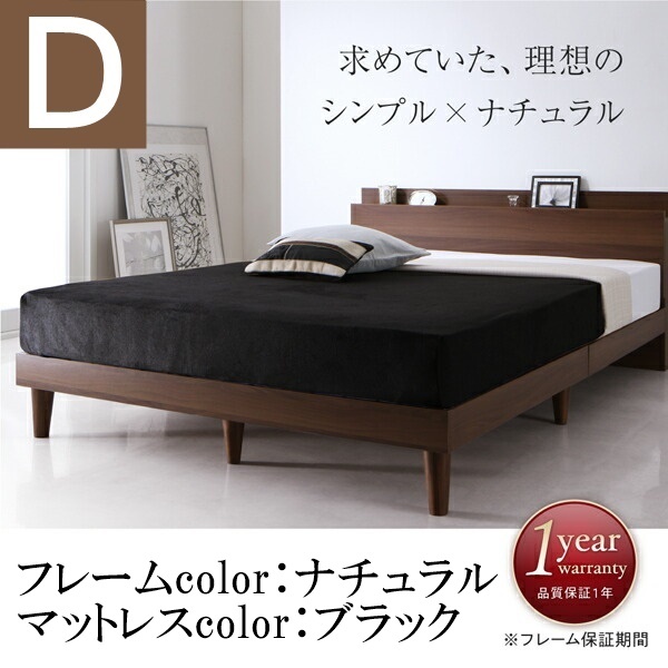 > 棚・コンセント付きデザインすのこベッド Camille カミーユ プレミアムボンネル付 ダブル ナチュラル×ブラック