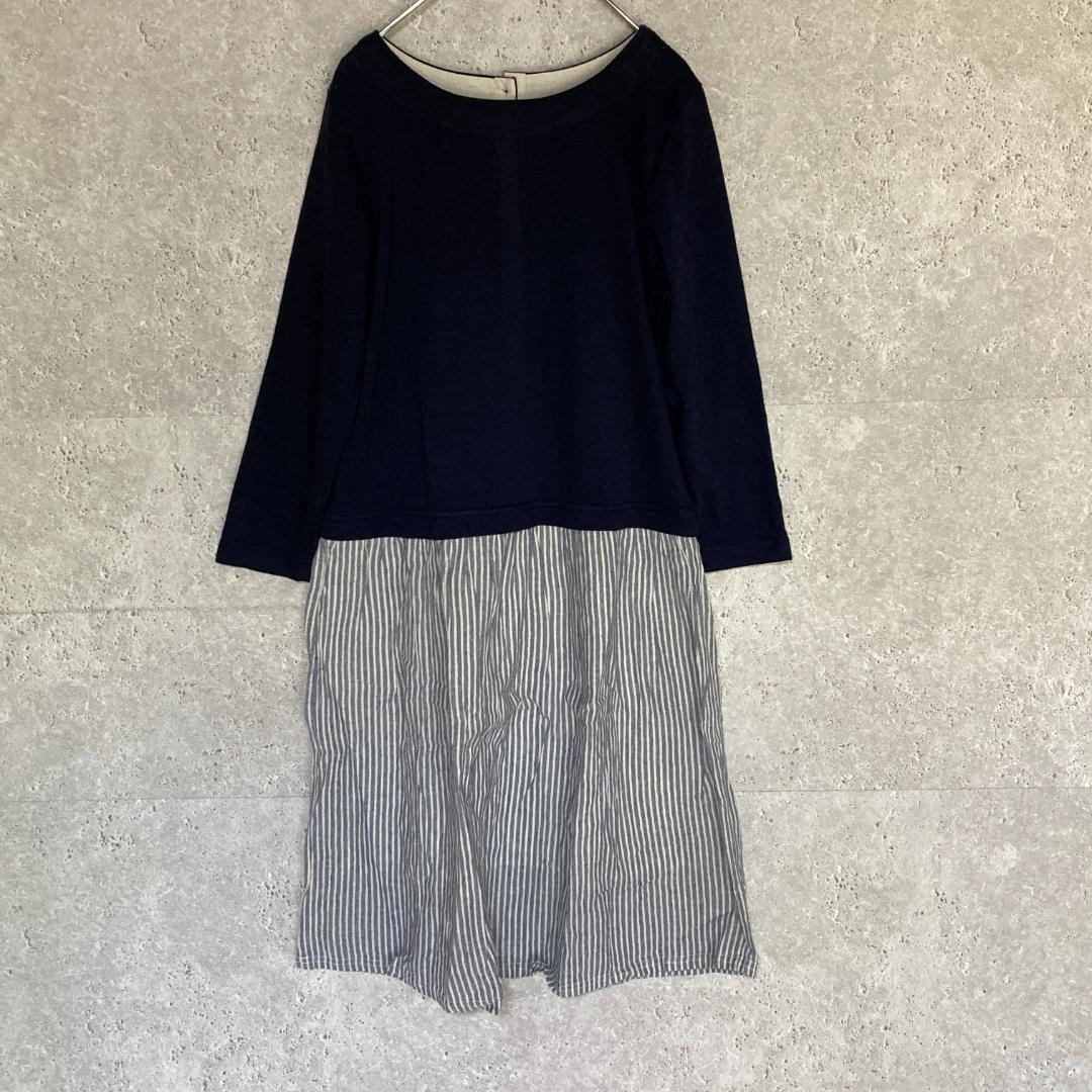 - M.M.O(M)長袖ドッキングワンピース*裏地*ストライプ*バックボタン*紺