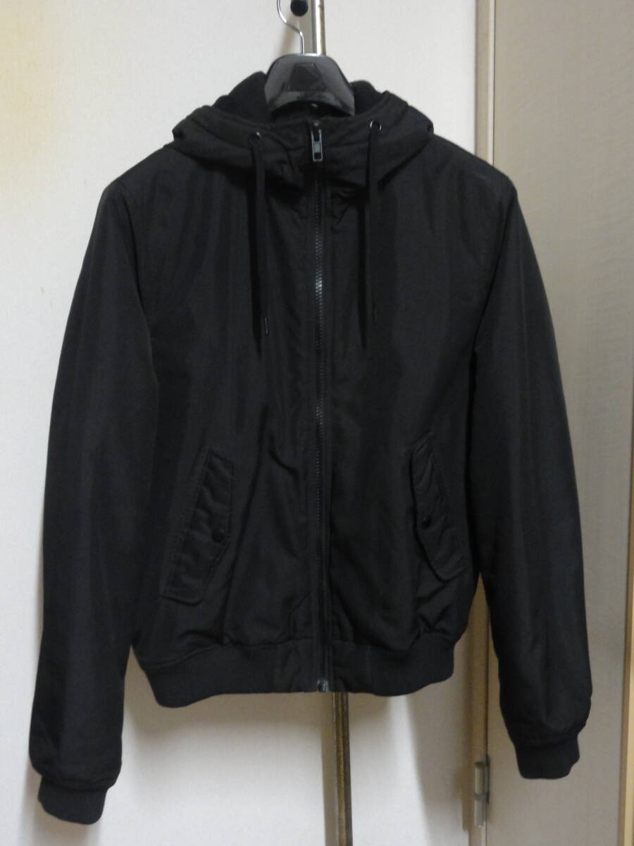 > 格安大きい(胸囲118cm位)・H&M(エイチアンドエム)・黒系地・フード付き中綿入りブルゾン(アウトドアブルゾン・マウンテンパーカー系?)M