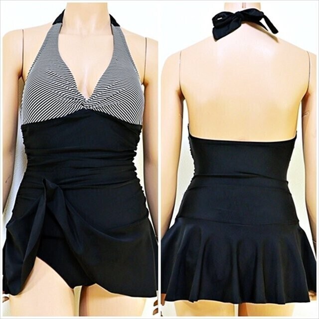 - PE5-B45T//ビッグなL☆ボーダー柄×黒☆ホルターネック☆スカートスイムウェア※一番安価な送料はゆうパケット280円