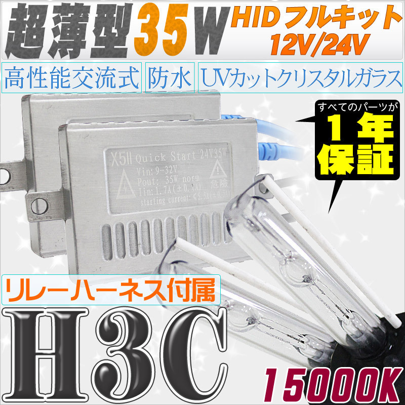- 高性能 薄型HIDキット 35W H3C リレー付 15000K 12V/24V 【交流式バラスト&クリスタルガラスバーナー】