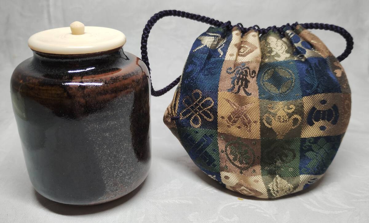 - 松本鉄山 中興名物 橋姫写 茶入 仕覆 花色石畳純子 共箱 茶道具