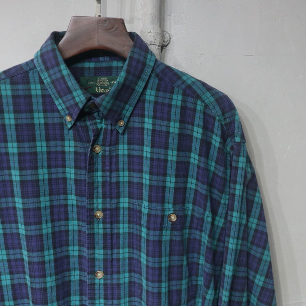 - 【即決】ORVIS オービス B.D ボタンダウンシャツ チェック柄 グリーン パープル 緑 紫 古着 M