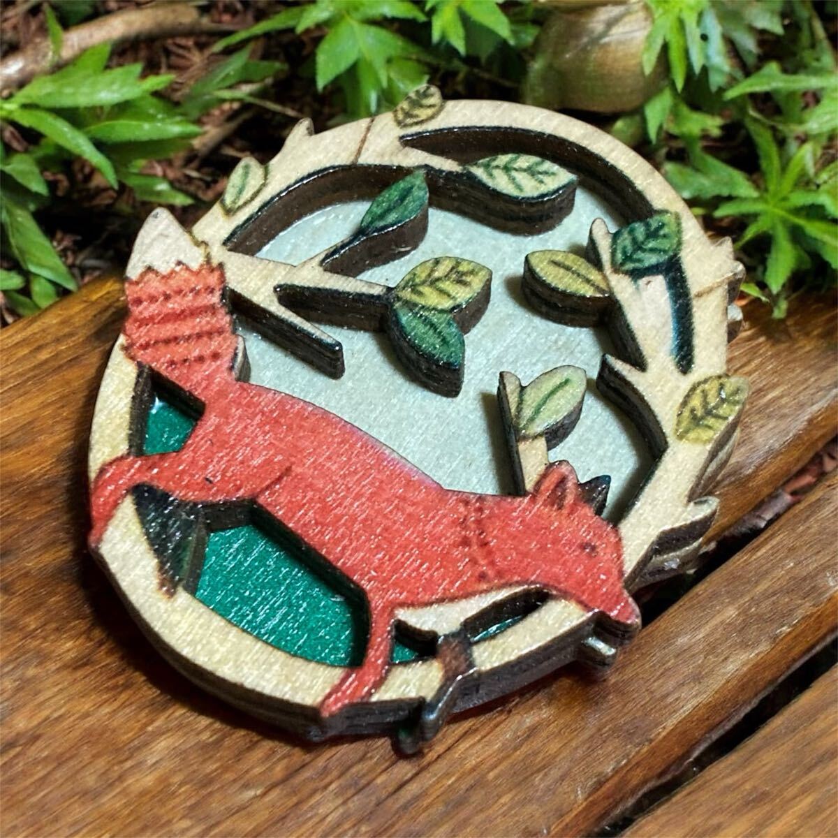 - 【木製ブローチ】気品 きつね 森 ブローチ お洒落 モダン 優しさ 可愛い ピンバッジ キツネ ピンズ 狐 自然 奥行き 立体的