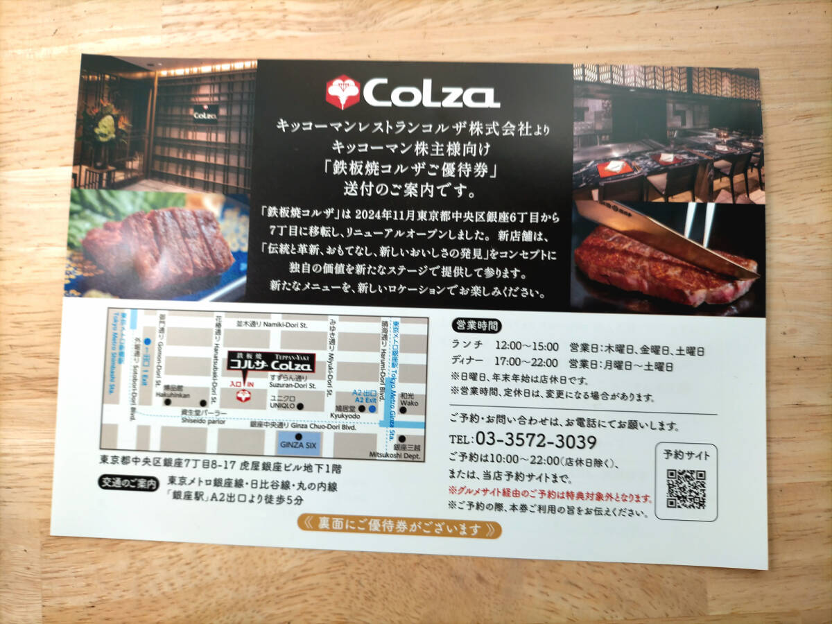 - ★キッコーマン株主優待・鉄板焼コルザご優待券(2026年6月末日まで)