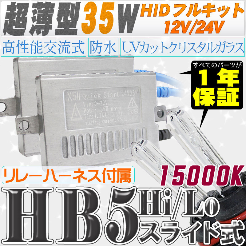 > 高性能 薄型HIDキット 35W HB5 Hi/Lo スライド式 リレー付 15000K 12V/24V 【交流式バラスト&クリスタルガラスバーナー】