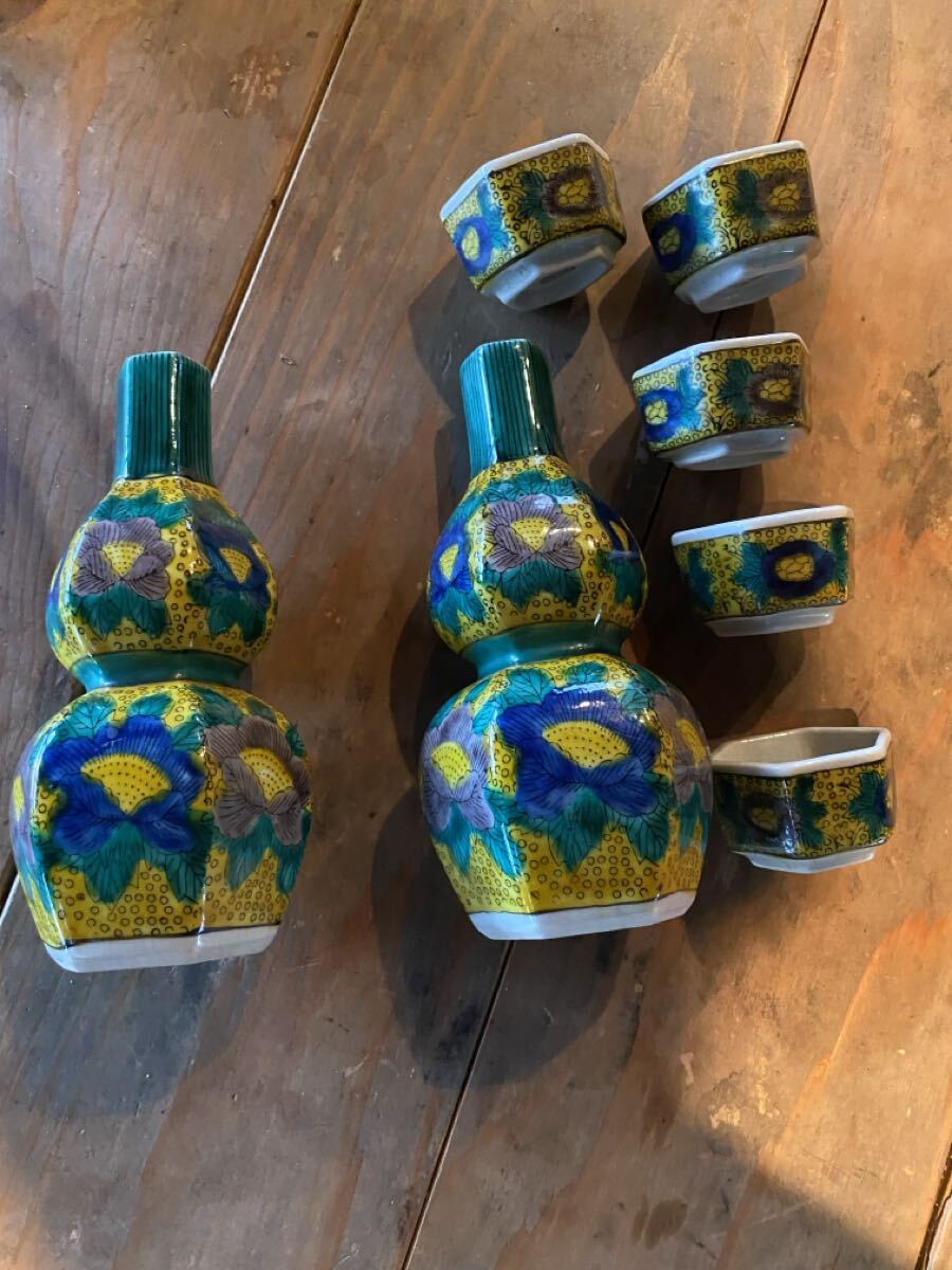 - 【送料無料】美品 九谷焼 東仙造 角福 色絵花柄 六角徳利2本 六角猪口5客 御酒器セット