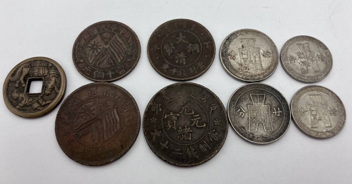 - 【14387】中国古銭 絵銭 馬曳/ 大清銅幣/光元緒賽/ 當十銅元/ 當制銭二十文/中華民国 25年 20分 廿分/拾分 おまとめ9枚 長期保管品