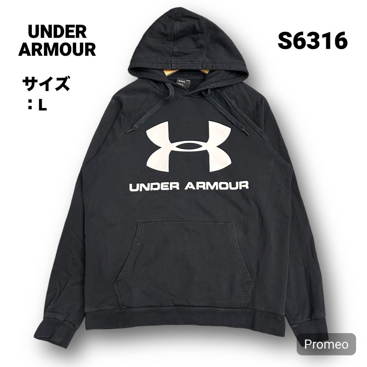 > 【S6316】 UNDER ARMOUR アンダーアーマー パーカー プルオーバー サイズL ブラック 黒 フロントプリント メンズ トップス 最落なし 古着