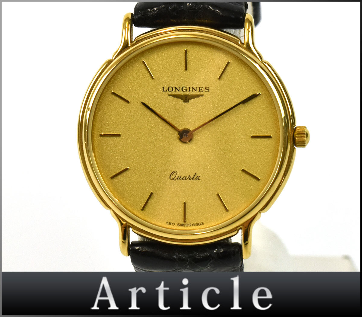 > 234826★動作確認済 LONGINES ロンジン メンズウォッチ 腕時計 クォーツ2針 ラウンド GP レザー 革 ゴールド ブラック アナログ/ D
