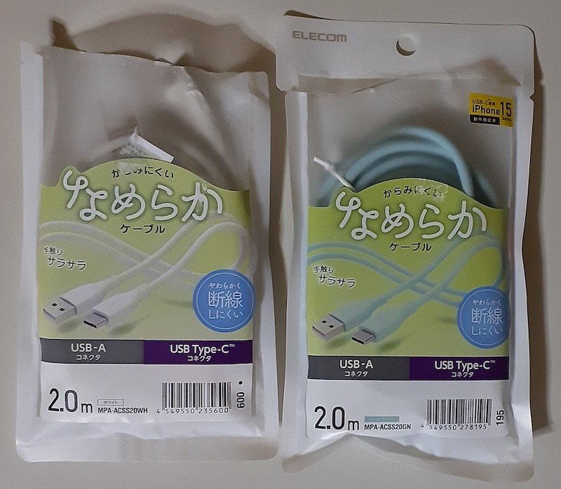- 6785 ELECOM USB-A - Type-Cケーブル 2.0m 2色セット MPA-ACSS20WH MPA-ACSS20GN からみにくいなめらかケーブル やわらかく断線しにくい
