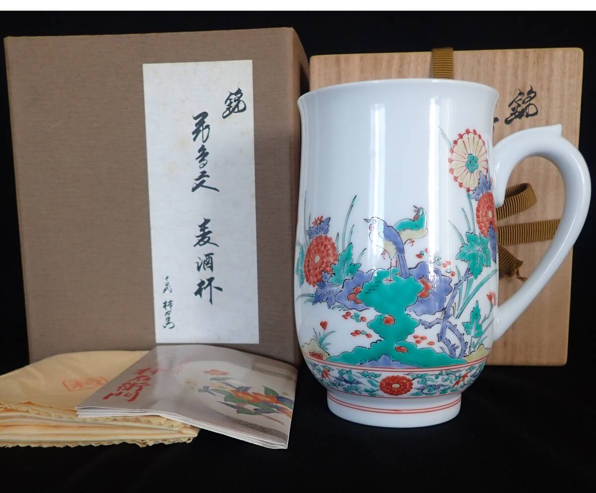 - 人間国宝十四代酒井田柿右衛門「錦 花鳥文 麦酒杯(KIRIN BEER M C)」サイズ 約(口径9,5×高14,5cm)二重共箱 栞 共布 美品!