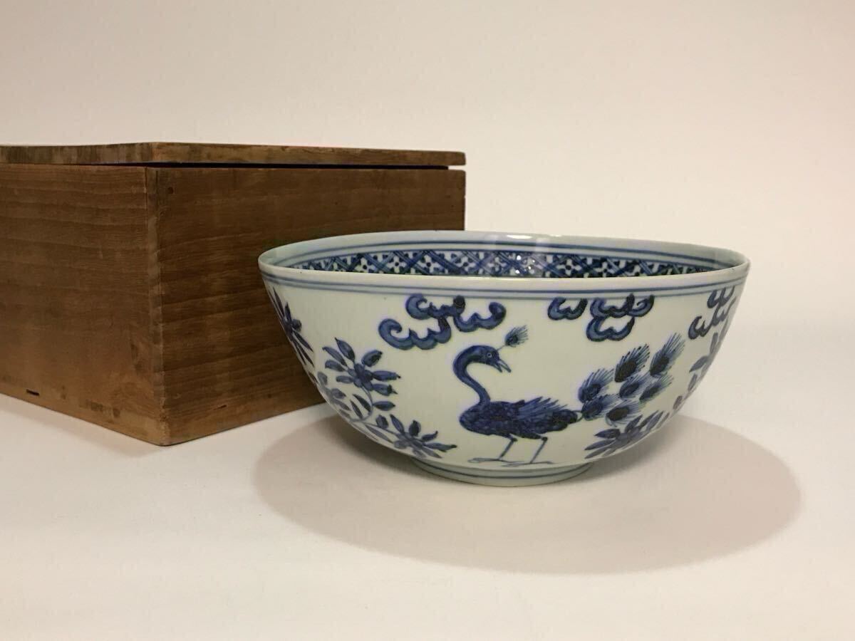 - 明朝期 染付花鳥文鉢 嘉靖年製銘 唐物 中国美術 箱付