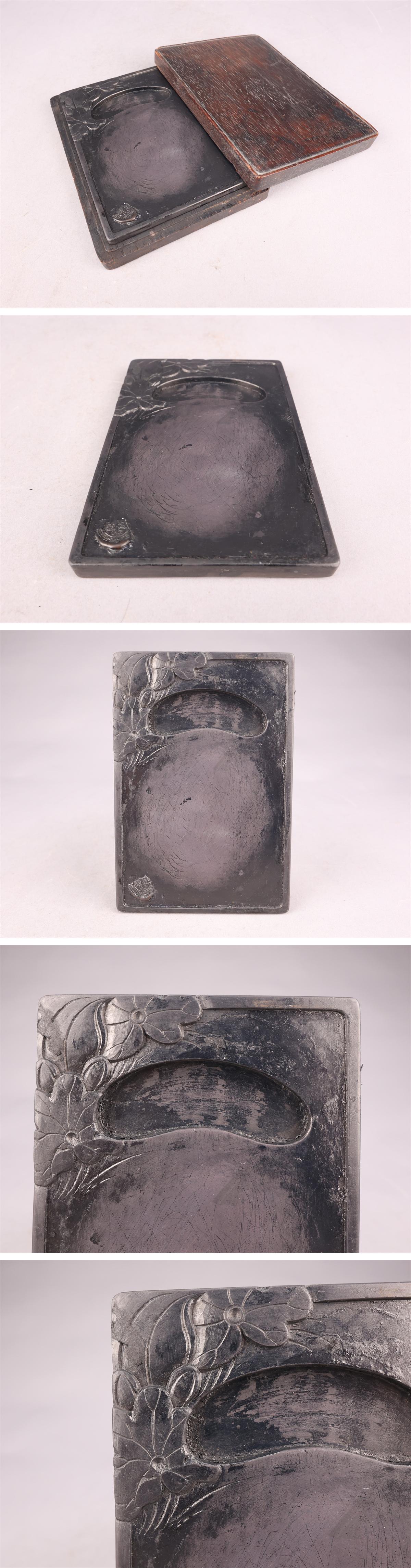 【志】A1035端硯 蓮彫刻 端渓硯 重量531g 唐木箱有拍卖