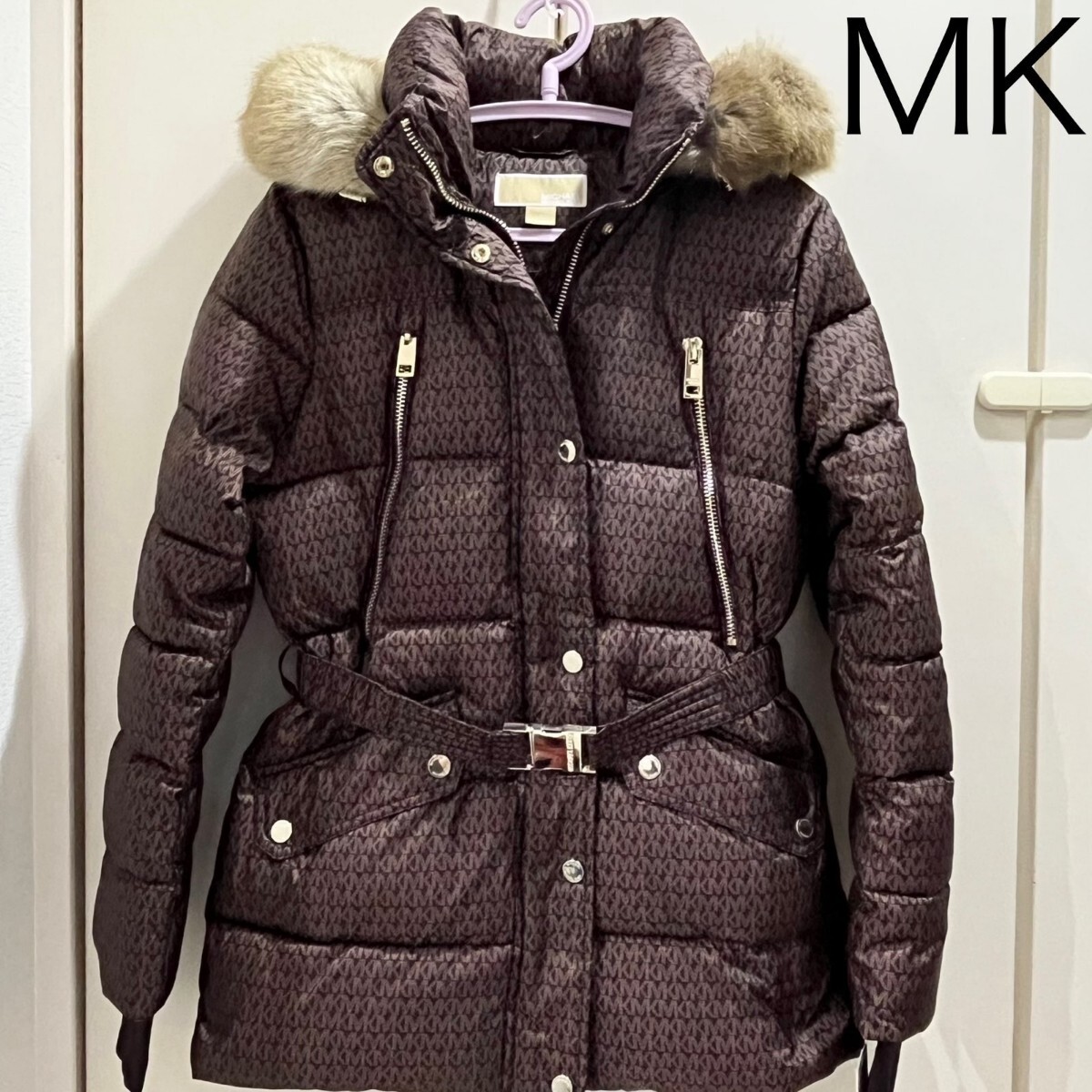 > マイケルコース MK 新品 ブランドファー 茶色 ベルト 総柄 ロゴ フード ダウンジャケット コート アウター レディース 防寒 2way 撥水 防風