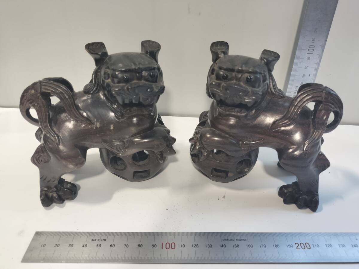 - シーサー 木彫り 2体 獅子 透彫 魔除け 置物 縁起物 古美術 沖縄 0-1006-06y1m