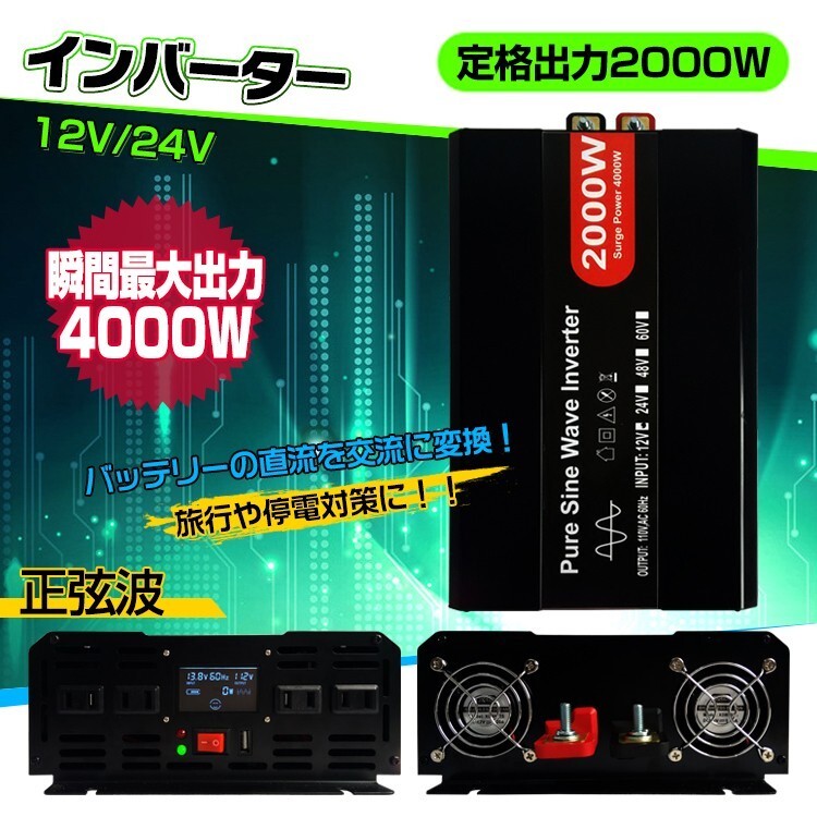 - 1円訳ありインバーター 2000W 正弦波 24V リモコン付き モニター表示 車 コンセント4個 USB1個 AC100V 変換 バッテリー 発電機 ee220-24v-w