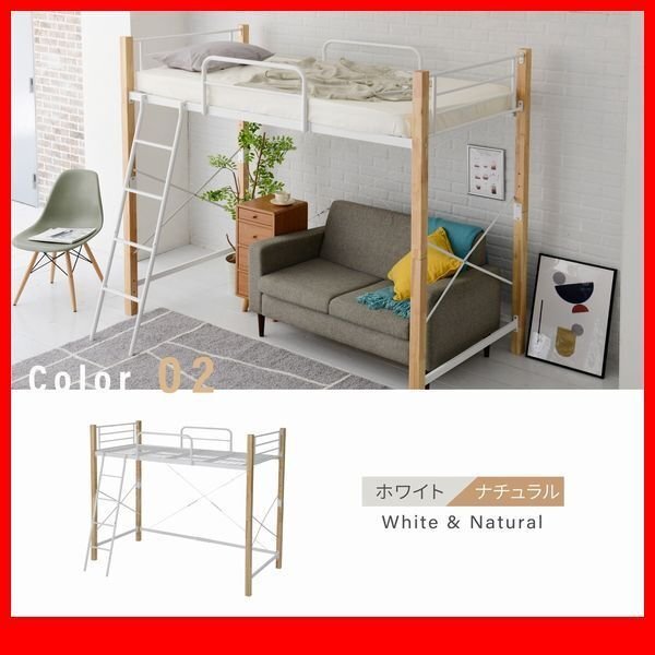 > ロフトベッド★天然木脚パイプベッド ロフトタイプ シングル/高級感 安心感 床下空間利用 メッシュ床/ホワイトxナチュラル/a3