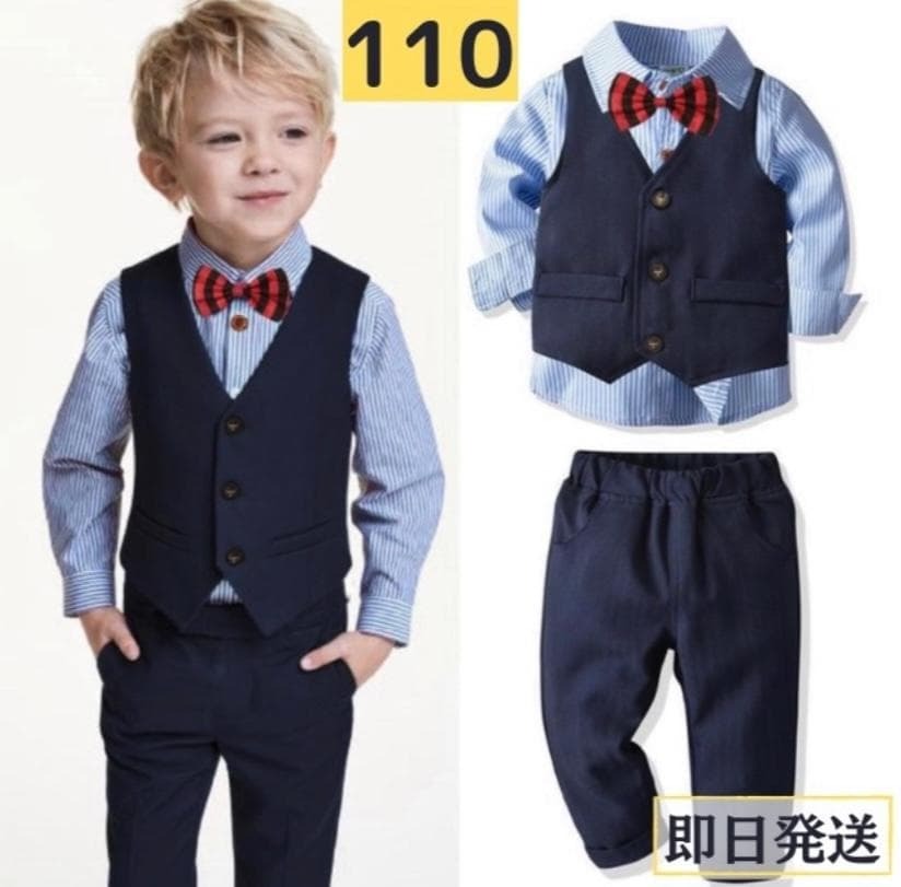 > 110 4点セット 男の子 フォーマル キッズ 長袖 ネイビー ストライプ
