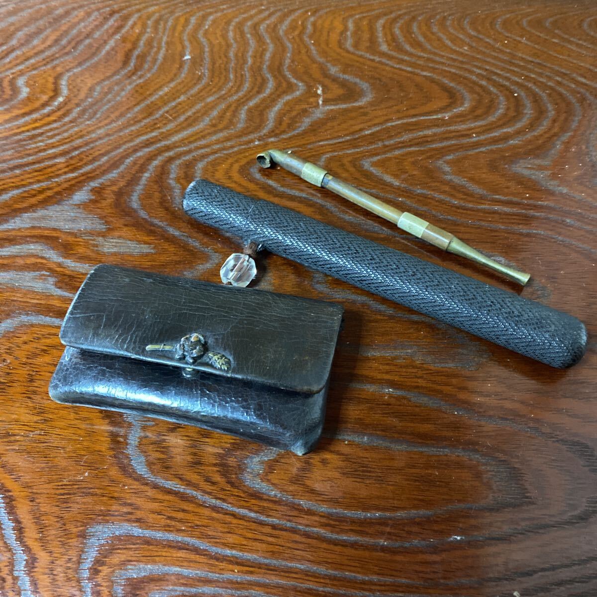 - 喫煙具、煙草ケースとキセル、 提げ物、旅姿人物金具、竹に銅と真鍮キセル、時代物