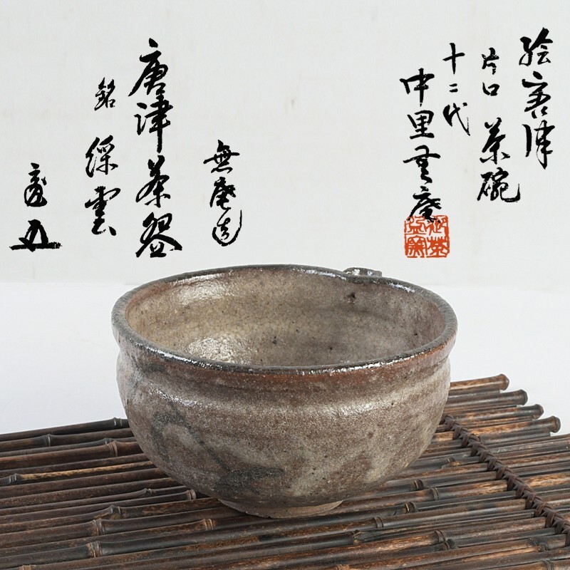 - 茶道具 十三代中里逢庵 絵唐津 片口茶碗 仕覆付 共布 裏千家十五代鵬雲斎極め箱 MYAF